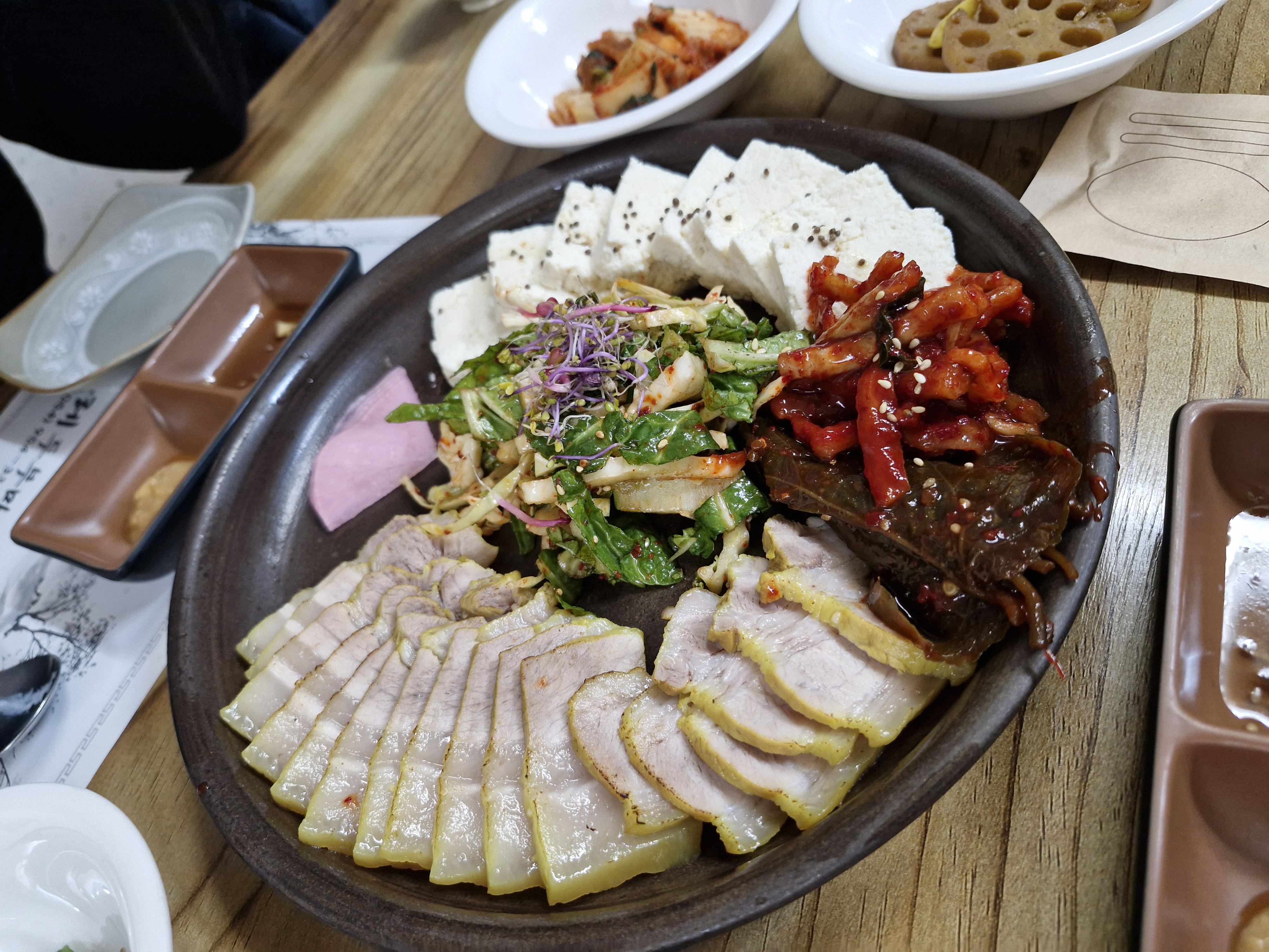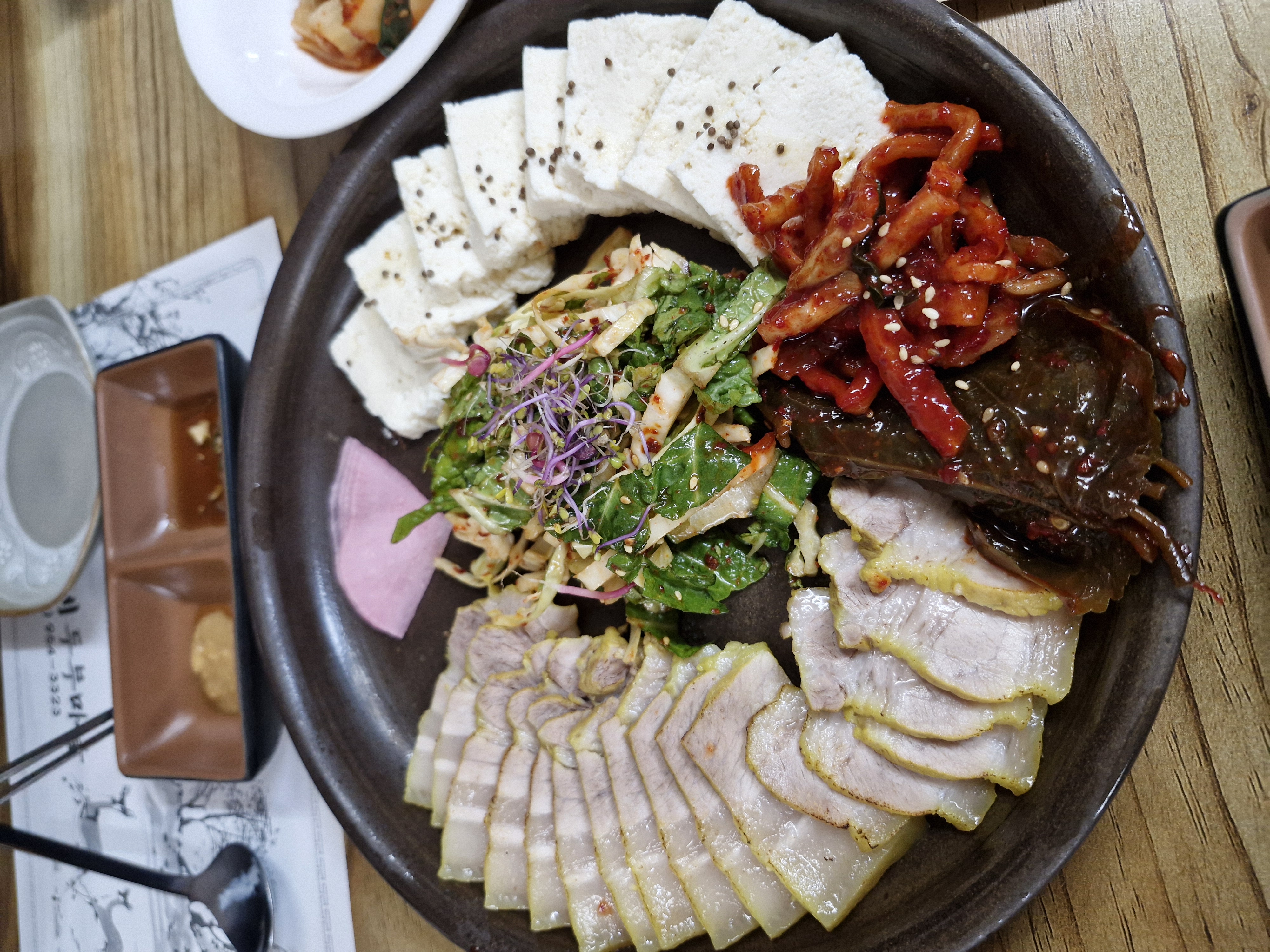 삼겹살 수육과 따뜻한 두부가 어우러진 보쌈 메뉴인데요