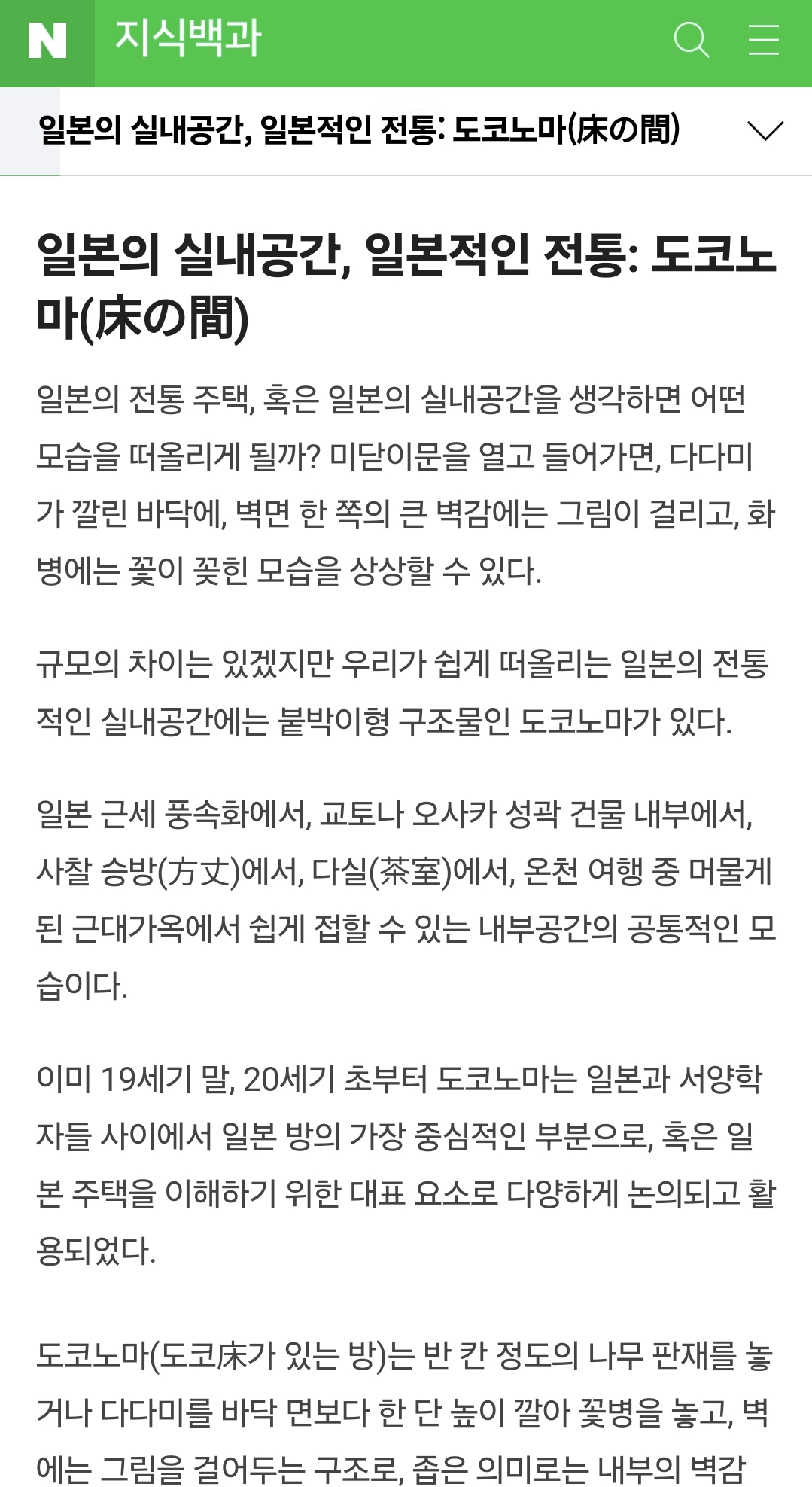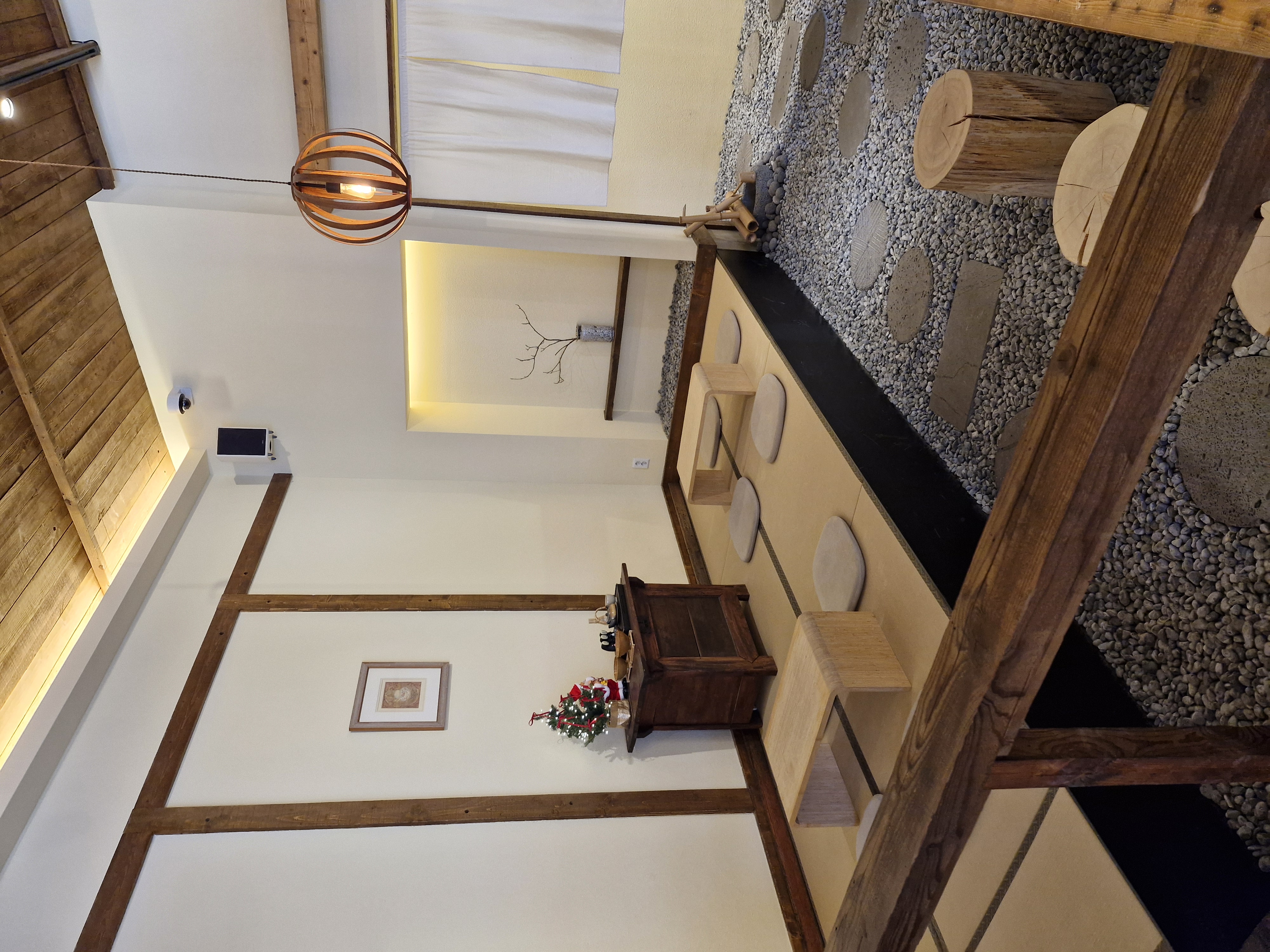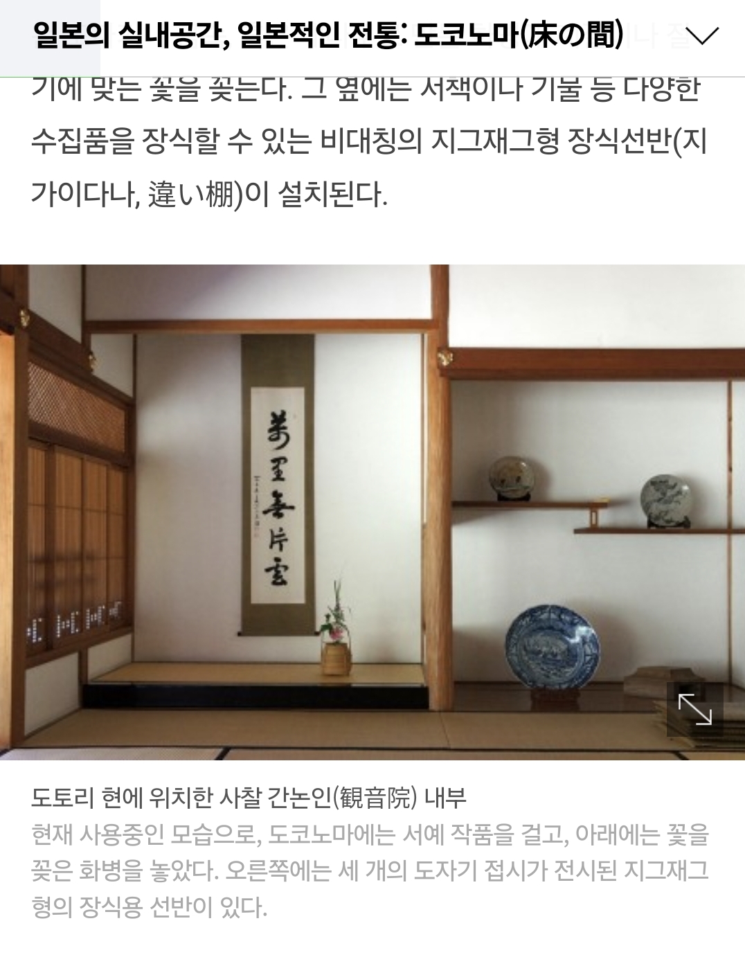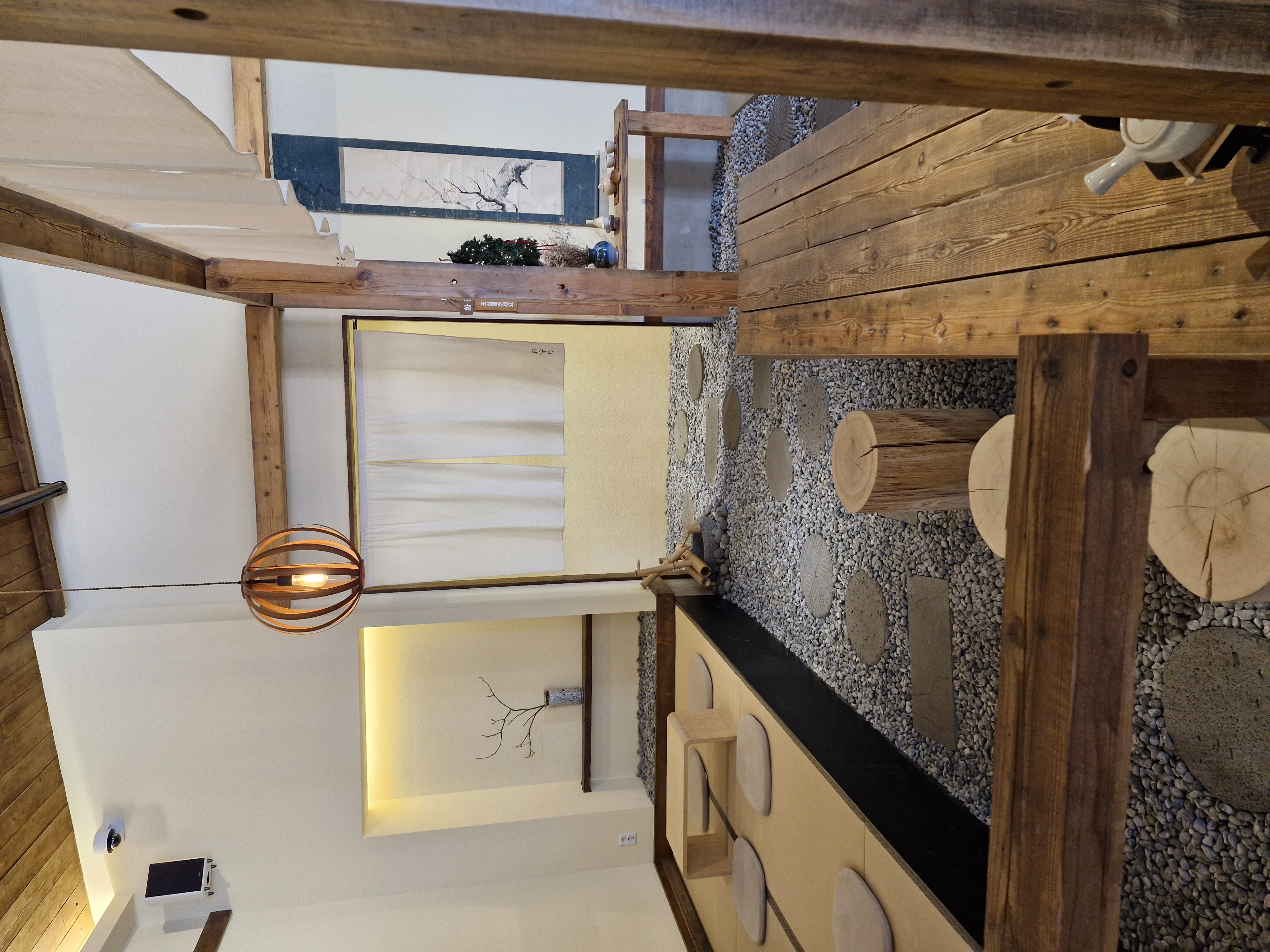 다다미 소재의 바닥, 나무로 된 구조물들, 일본 전통 건축물의 형태인 도코노마가 연상되는 벽 등이 인상적입니다