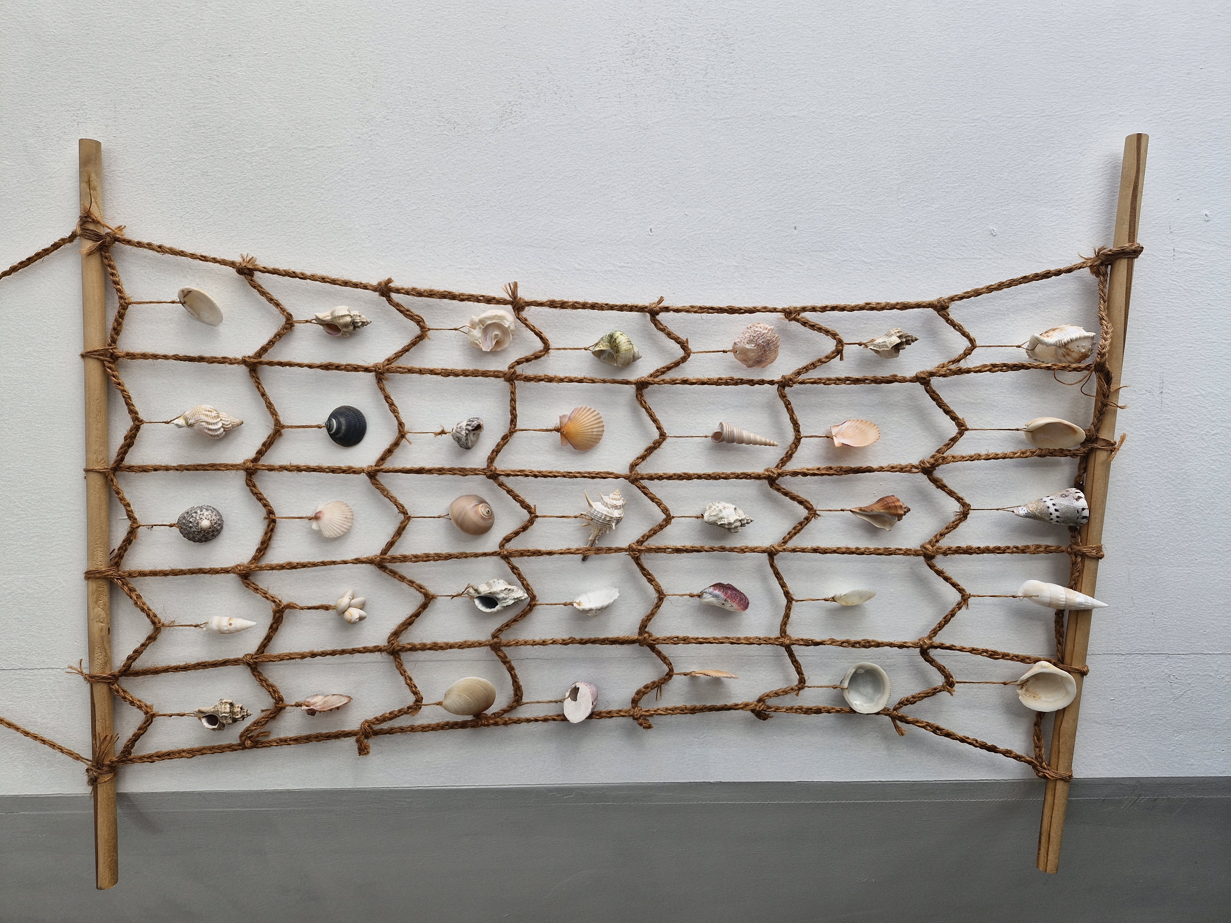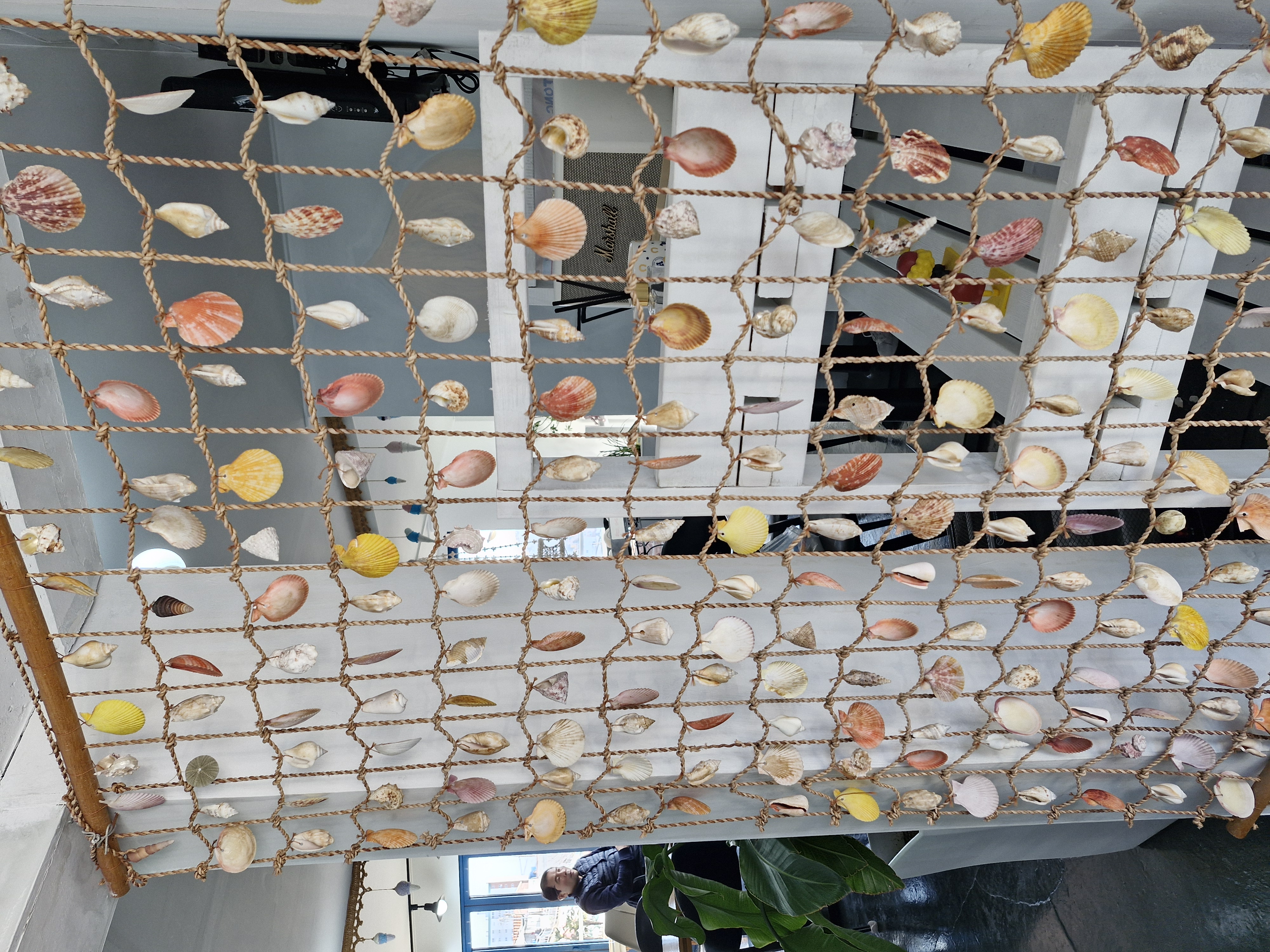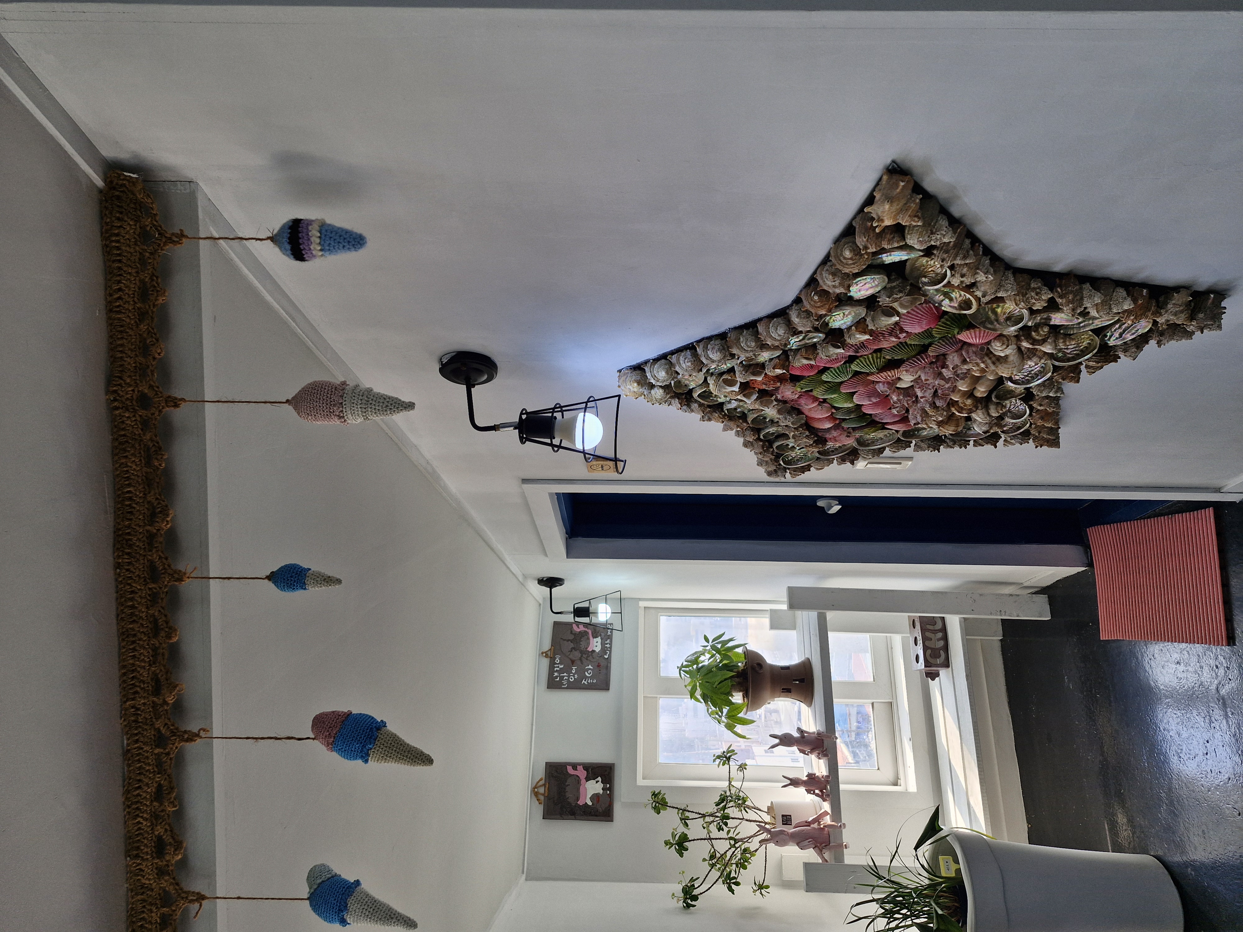 카페 동피랑 츄 입구에 각종 조개, 해산물 껍데기를 예쁘게 걸어 만든 망 장식이 있어요
