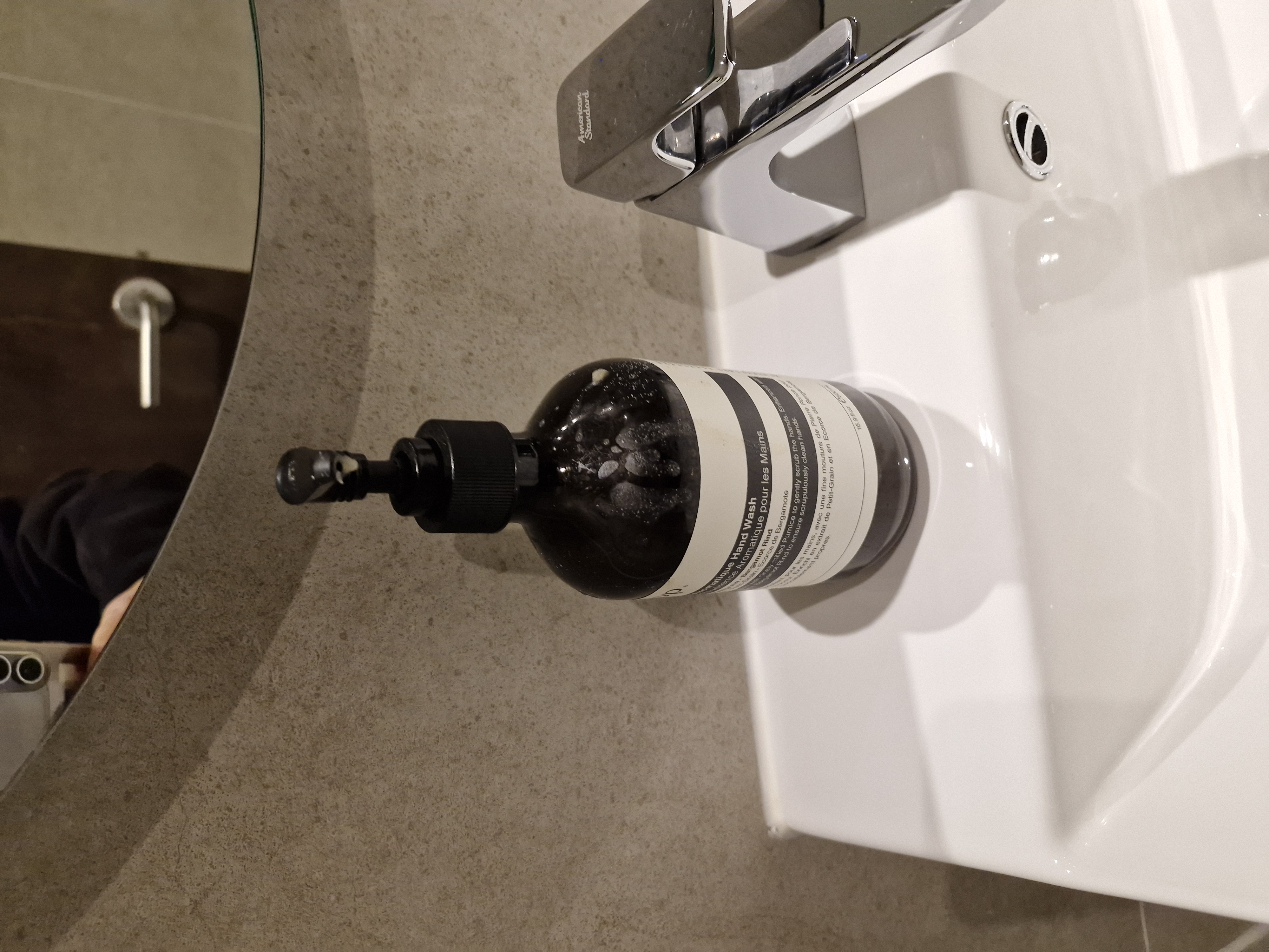욕실의 이솝 핸드워시와 샴푸, 바디워시입니다