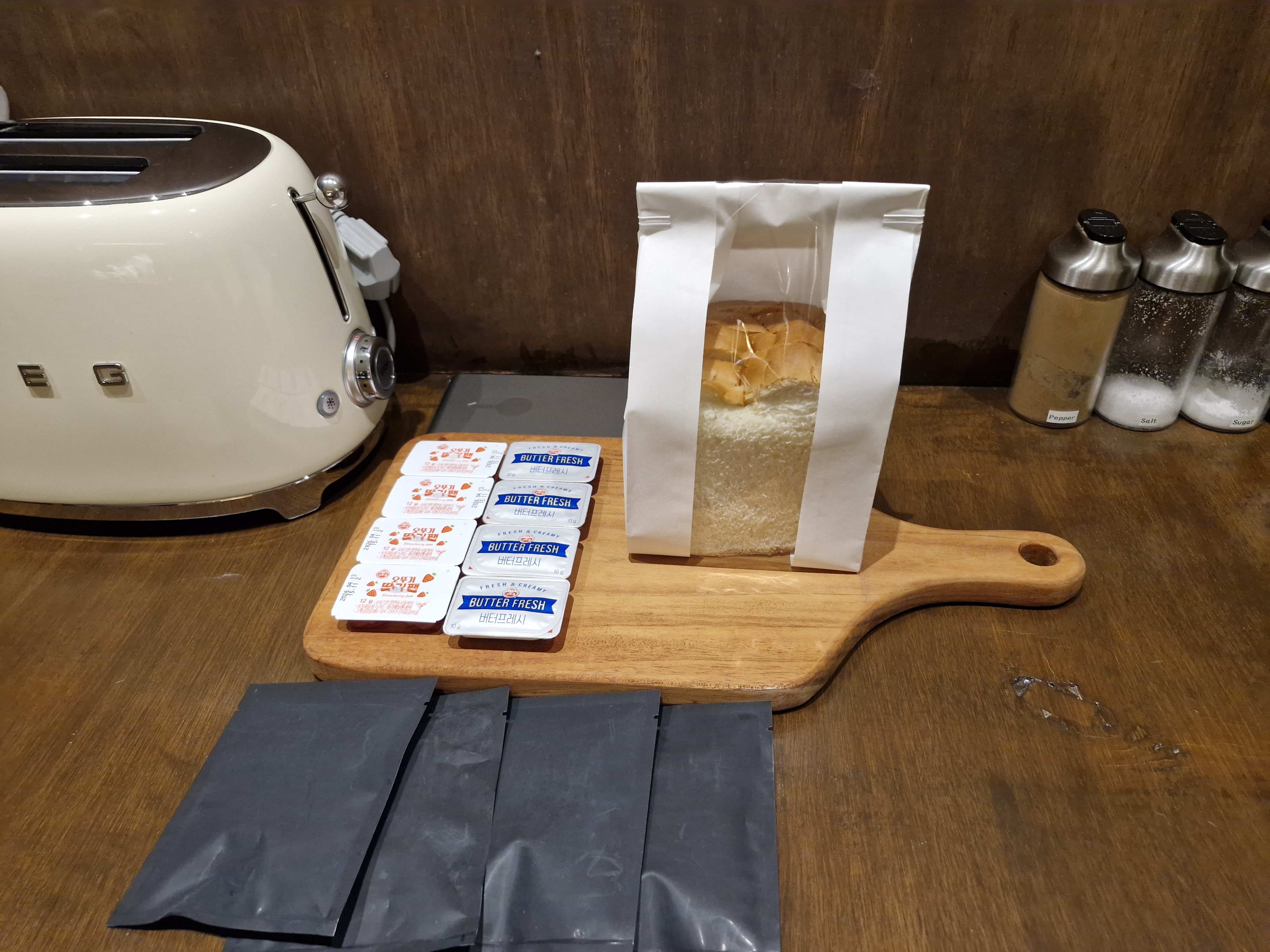 부엌은 식빵 버터 딸기잼, 그리고 드립커피가 있어서 아침 가벼운 식사로 이용하기 좋고요
