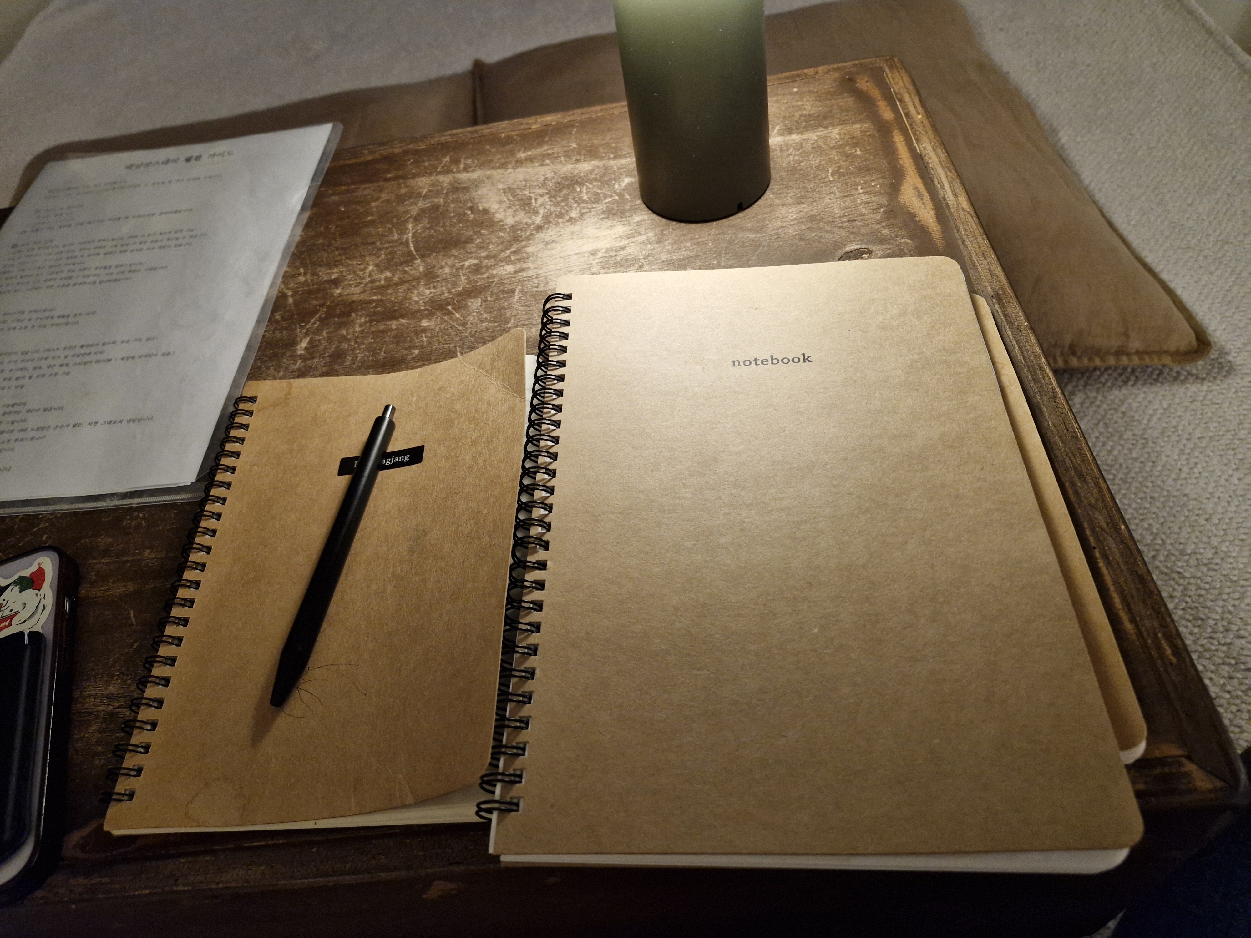 통영 배양장스테이의 거실 테이블에 놓인 노트입니다
