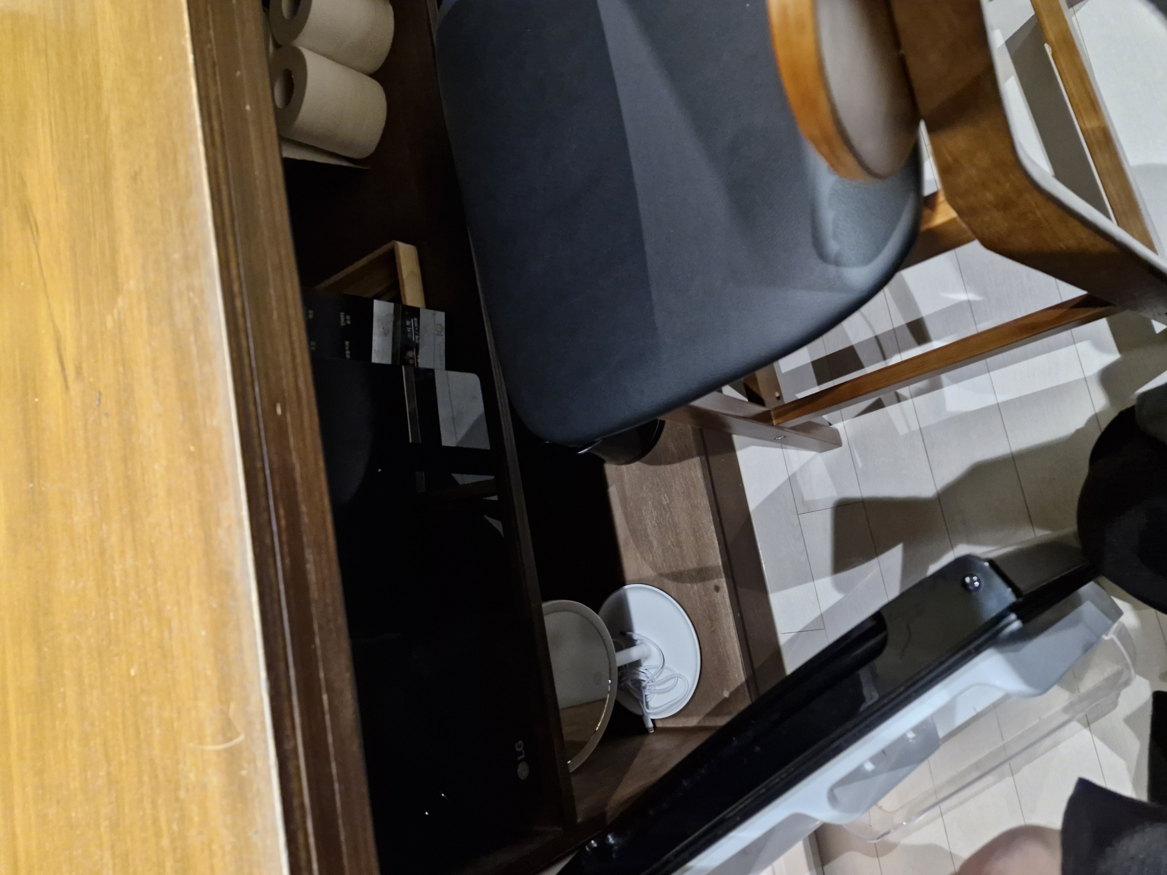 식탁 아래에는 거울, 휴지 등 각종 생활용품이 있습니다