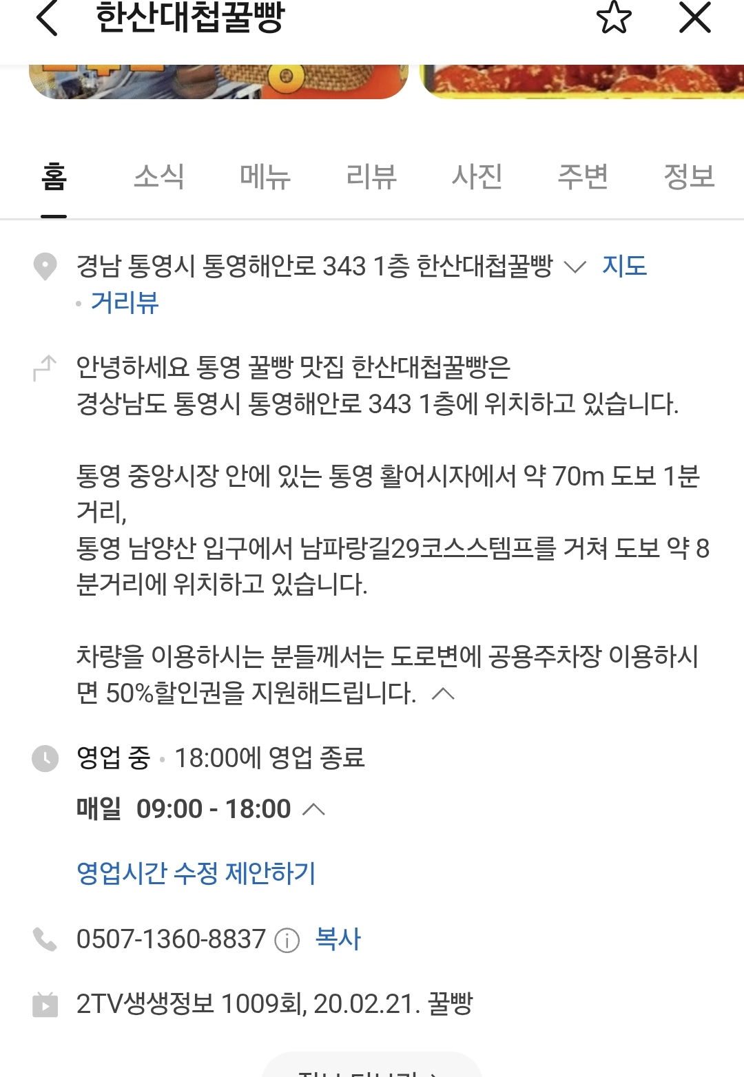통영 덜 단 꿀빵 판매하는 한산대첩꿀빵은 도로변 공영주차장 이용 시 50% 할인권을 지원한다고 합니다