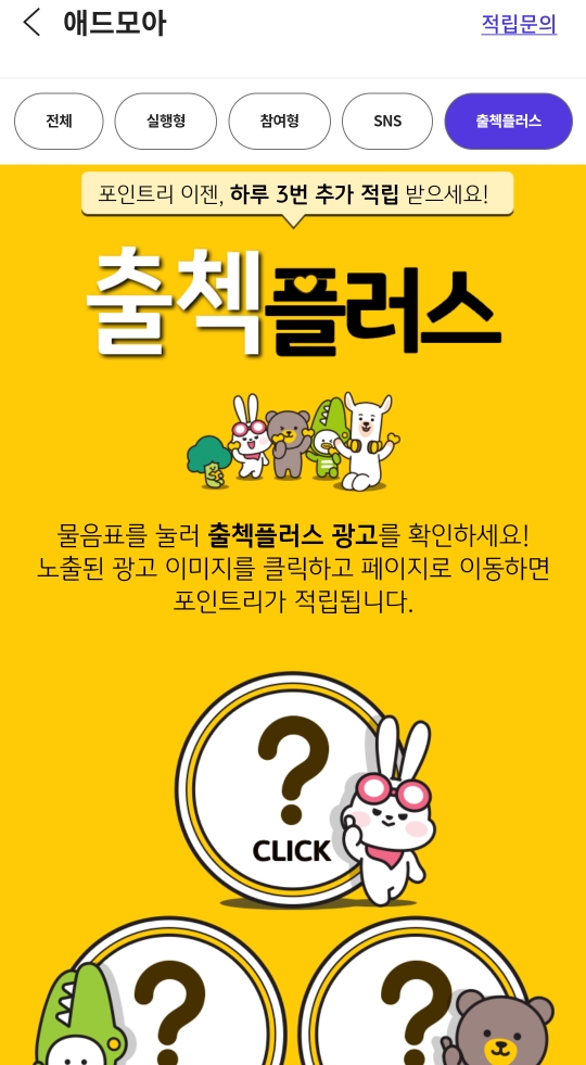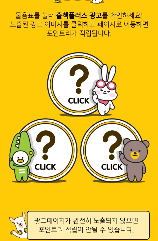 출첵플러스에 들어가면 캐릭터와 함께 물음표 세 개가 보여요