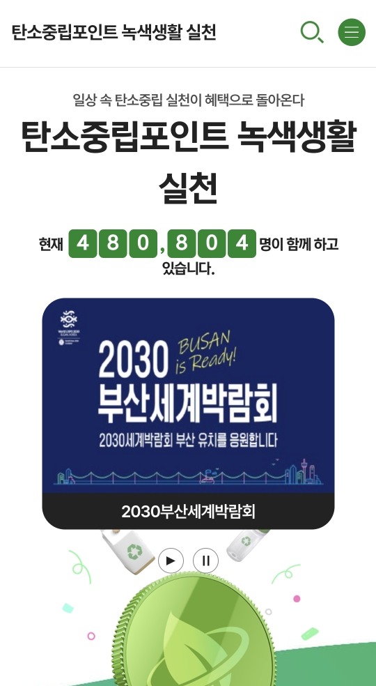 일상 속 탄소중립 실천이 혜택으로 돌아온다 탄소중립포인트 녹색생활 실천 현재 481436명이 함께 하고 있습니다.