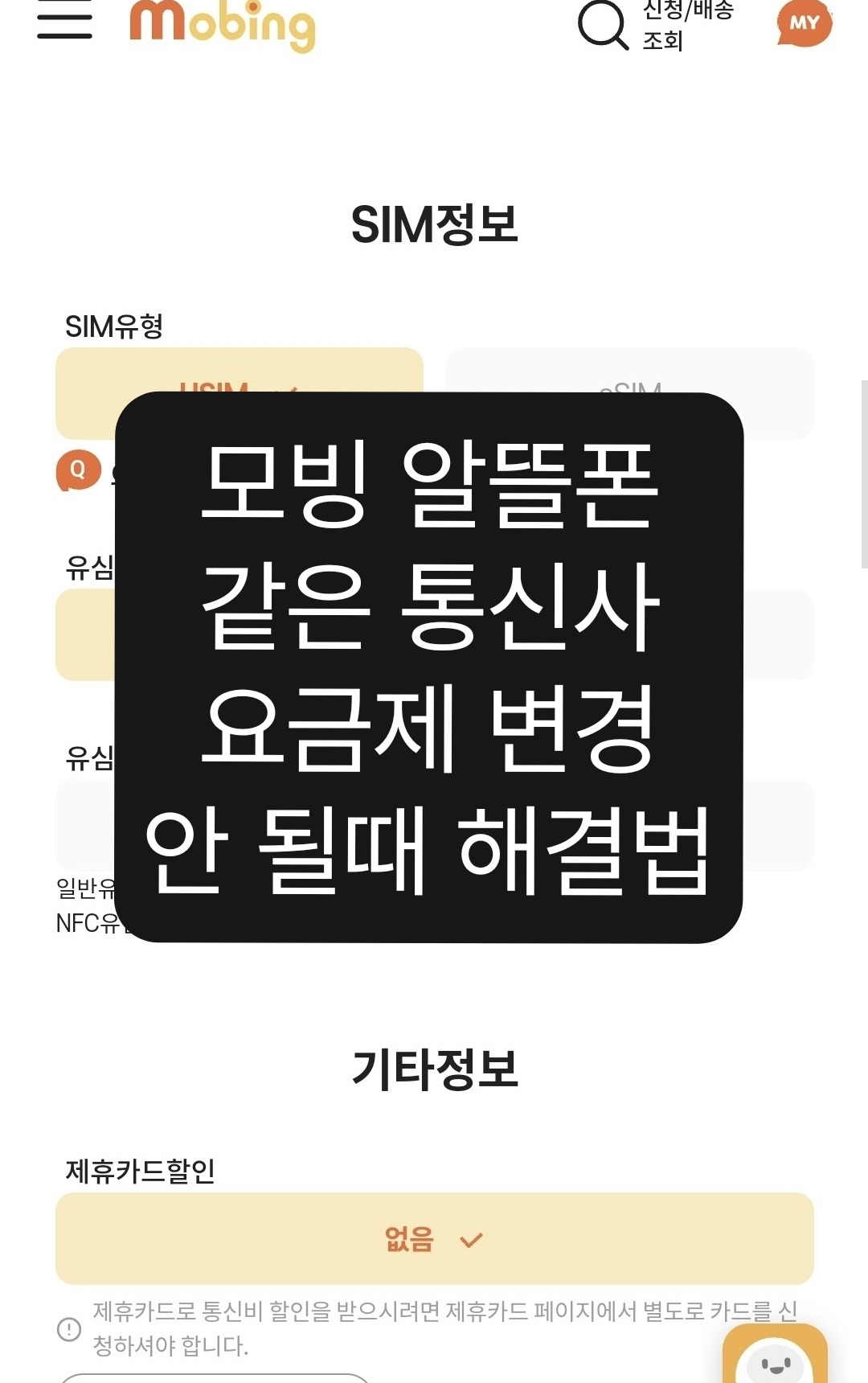 고물가 시대인 요즘, 저렴하게 알뜰폰을 사용하는 분들이 많을 것 같습니다 저 역시 모빙(유니컴즈)을 이용해 저렴한 알뜰폰 요금제를 사용하고 있는데요 최근, 기존 skt망 요금제에서 다른 skt망 요금제로 상품을 변경하려 했는데요계속 유심을 사야 한다는 표시가 뜨는 겁니다같은 통신사 망인데 왜 자꾸 유심을 사야 한다는 거지?? 혹시나 해서 '유심보유'를 선택하고, 기존 유심칩의 번호를 입력해도 '사용할 수 없는 유심'이라고만 하는 거예요 그래서 머리가 아파, 그냥 '유심구매'를 클릭하고 가입을 진행했더니, 또 '같은 skt망이라서 가입 불가능'이라고 하더라고요 이 문제로 며칠 머리가 아팠는데, 원인과 해결책을 찾았습니다 모빙 이용자 분들 아래 내용 잘 따라오세요 아마 다른 알뜰폰 통신사 이용자 분들도 참..