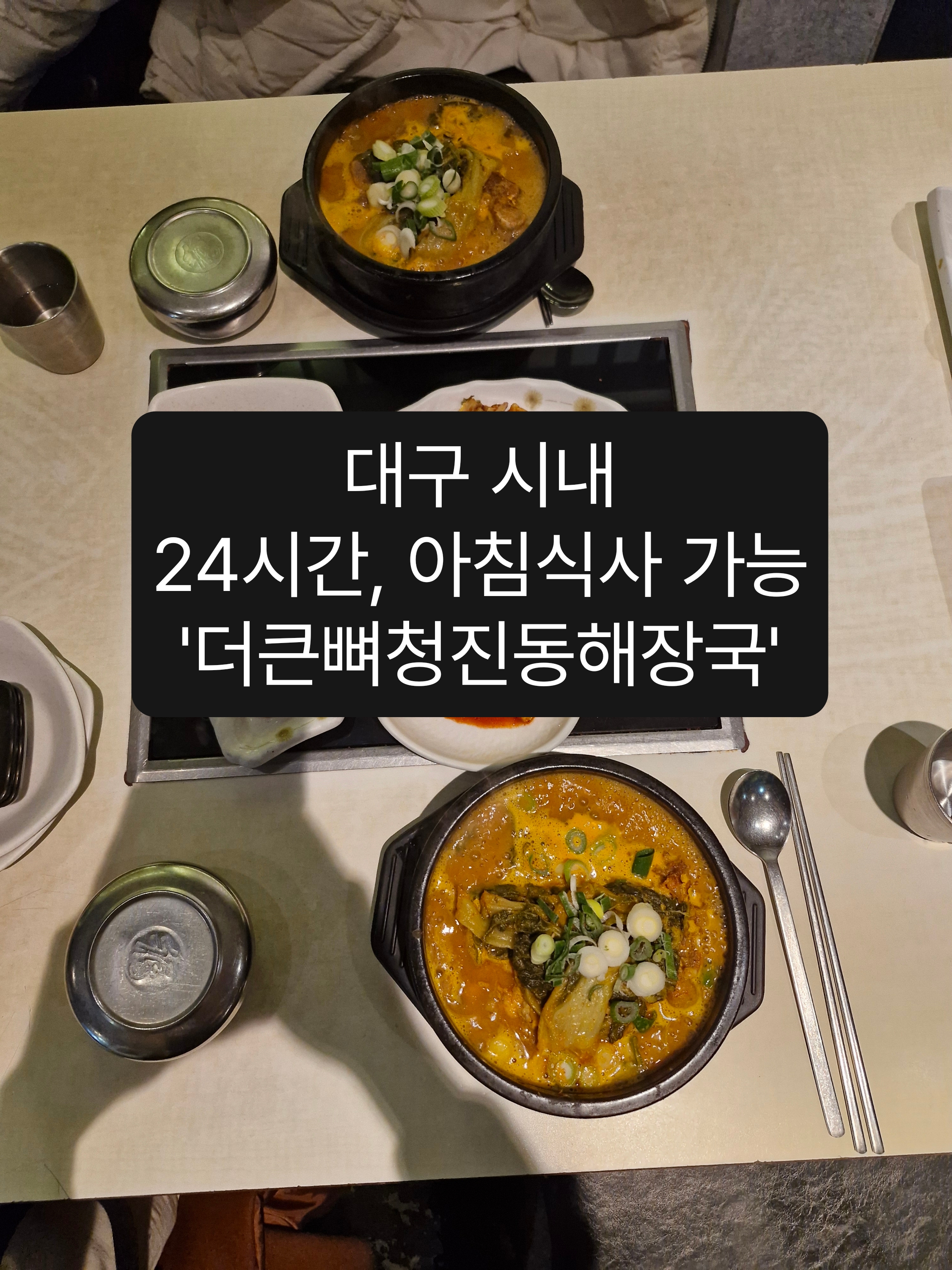 대구 시내 동성로 반월당 일원에서 24시간 해장, 아침식사 가능한 식당에 다녀왔습니다더큰뼈청진동해장국 내돈내산 리뷰입니다📍동성로 반월당 24시간 아침식사 '더큰뼈청진동해장국' 위치, 주차동성로 24시간 해장국 더큰뼈청진동해장국은 반월당역에서 500미터 안 되는 거리에 있습니다술집 많은 클럽골목쪽이랑 가까운거같았고,주변에 숙박업소 모텔도 많더라고요시내 한복판에 있는 곳이고, 인근 골목이 협소하기 때문에 차를 댈 만한 곳은 없는 편입니다참고하세요인근 공영/유료 주차장 등을 이용하시길 바랍니다📍동성로 반월당 24시간 아침식사 '더큰뼈청진동해장국' 내부, 메뉴동성로 아침식사 더큰뼈청진동해장국은 야외에도 테이블이 있습니다아직 날씨가 추워서 이용하는 분들은 없었는데,흡연하는 분들은 여기서 식사하며 술 한 잔 해..