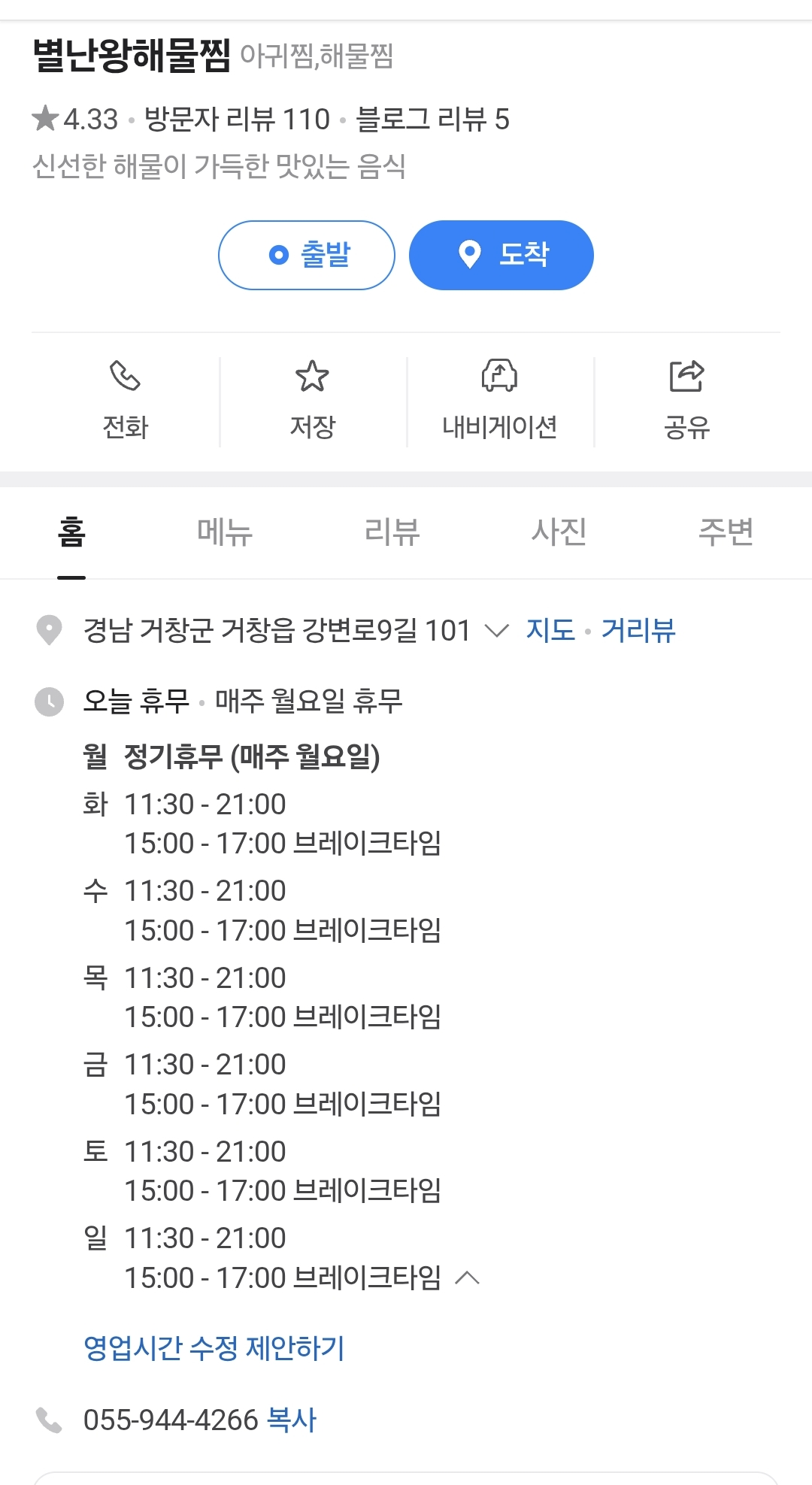 거창 창포원 근처 로컬맛집 '별난왕해물찜' 위치, 주차