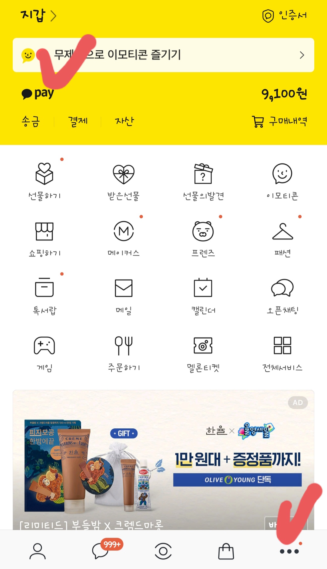 카카오톡 앱 켜기->하단 제일 오른쪽 점 세개(•••) 버튼 클릭 ->상단의 pay 글자 클릭(빨간 체크)